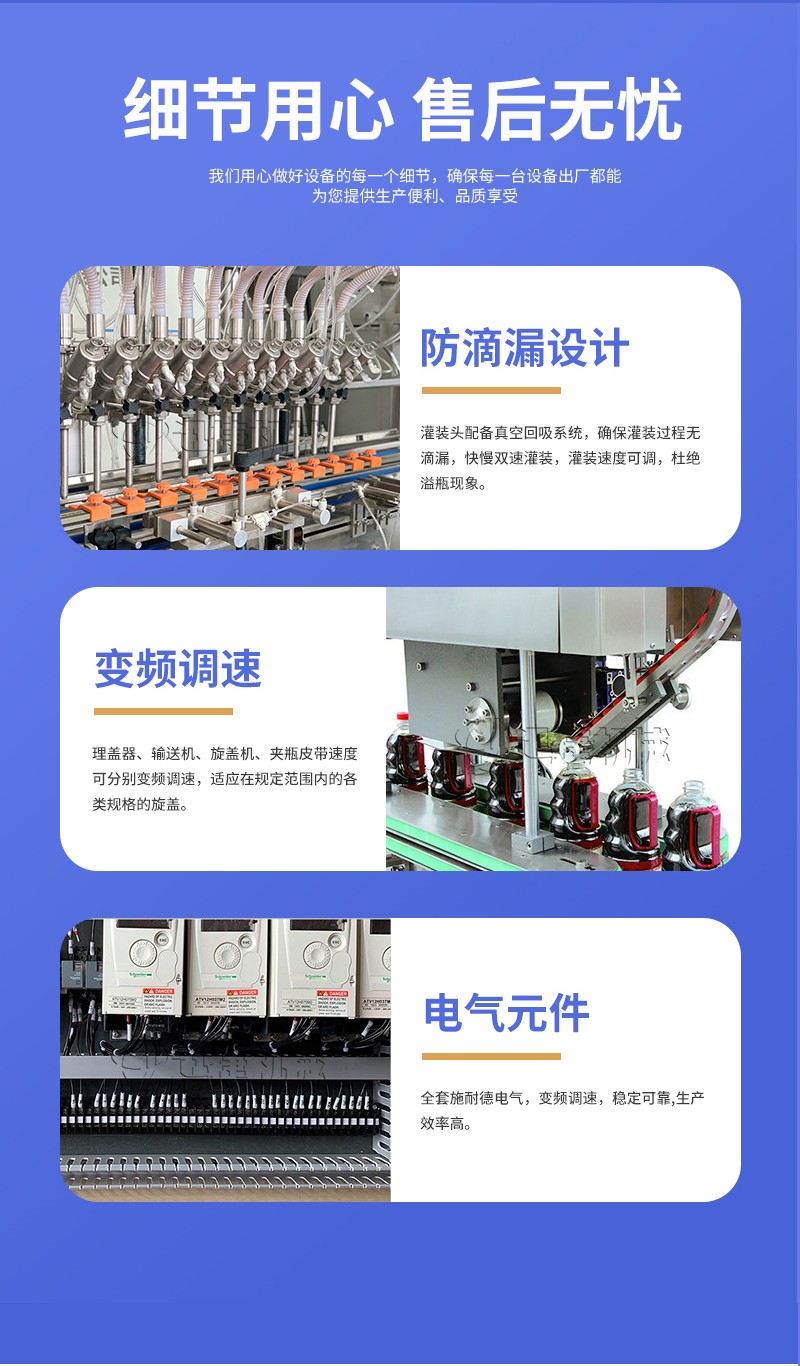 3、灌裝閥采用優質灌裝閥,下料速度快,灌裝量精準,且無滴漏現象產生。