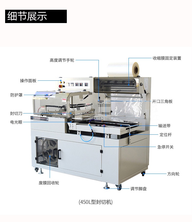配合L型封切刀使收縮膜包裝一次封切成型,鍍特氟龍不粘層封口布,封切不黏膜,且封口整齊不開裂,產(chǎn)品經(jīng)封切后,進(jìn)入自動塑料膜熱收縮包裝機完成包裝。